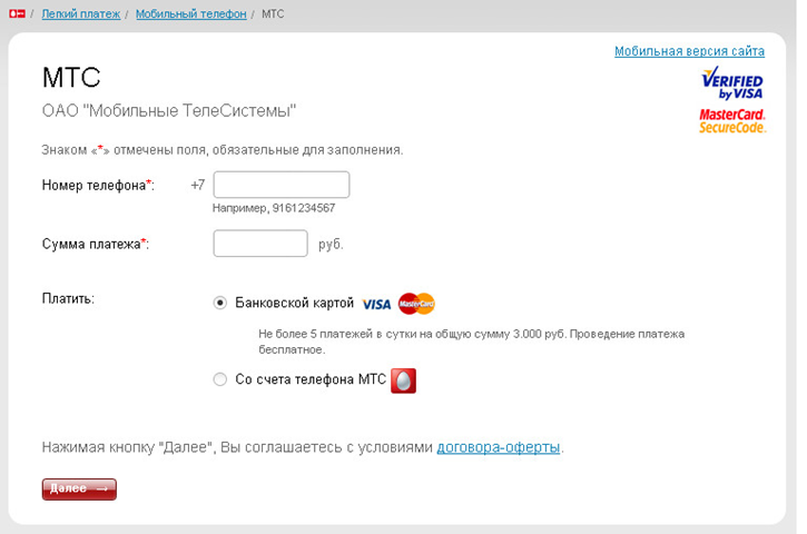 Использование сайта www.pay.mts.ru является вторым универсальным способом управления услугой. Для начала абонентам необходимо пройти простую процедуру регистрации, которая состоит из нескольких шагов. Далее Личный кабинет МТС предлагает пользователю неограниченные возможности. В левой части сайта находится раздел «Платежи». Здесь Вы найдете исчерпывающую информацию об использовании опции.